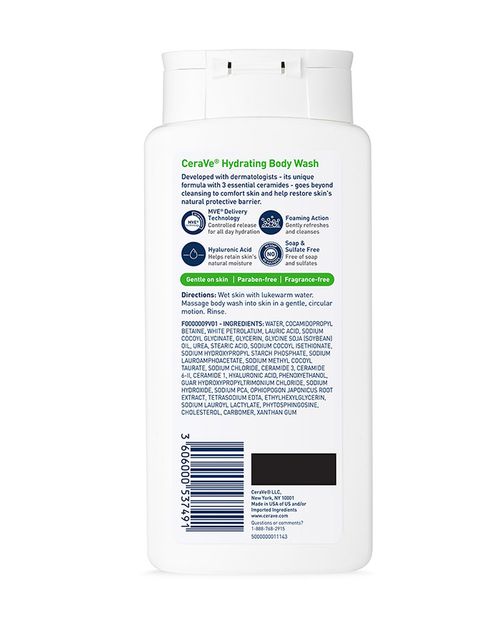 CeraVe Hydrating Body Wash was developed with dermatologists to cleanse and refresh the skin while restoring the skin’s natural barrier. In addition to three essential ceramides and hyaluronic acid, our cleanser for the body includes emollients to moisturize and soften the skin all day. Best of all, this non-irritating, gentle cleanser formula is suitable for normal to dry skin.